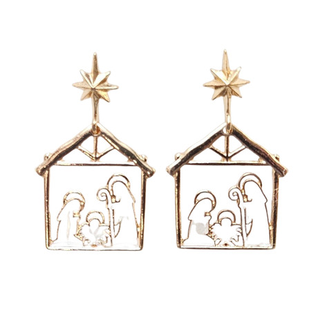 Our nativity dangle earrings are gold tone earring design with pearlized, enamel insets mixed with cutouts throughout the design.
